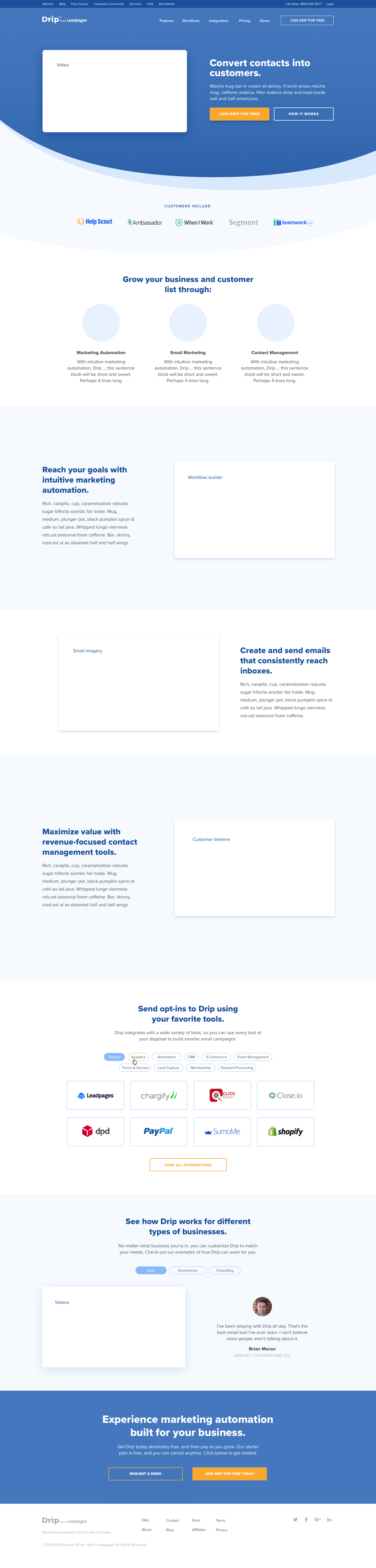 After completing a full redesign of Drip's website, I wanted to take the necessary steps to make sure the homepage was performing at its highest capacity. Collaborating with content marketers and another designer, we were able to outperform the original homepage in both A/B tests and user tests with this variation. This variation centered around the idea of "turning contacts into customers." This variation also included an update to Drip's color palette and an overall expansion of Drip's visual language.