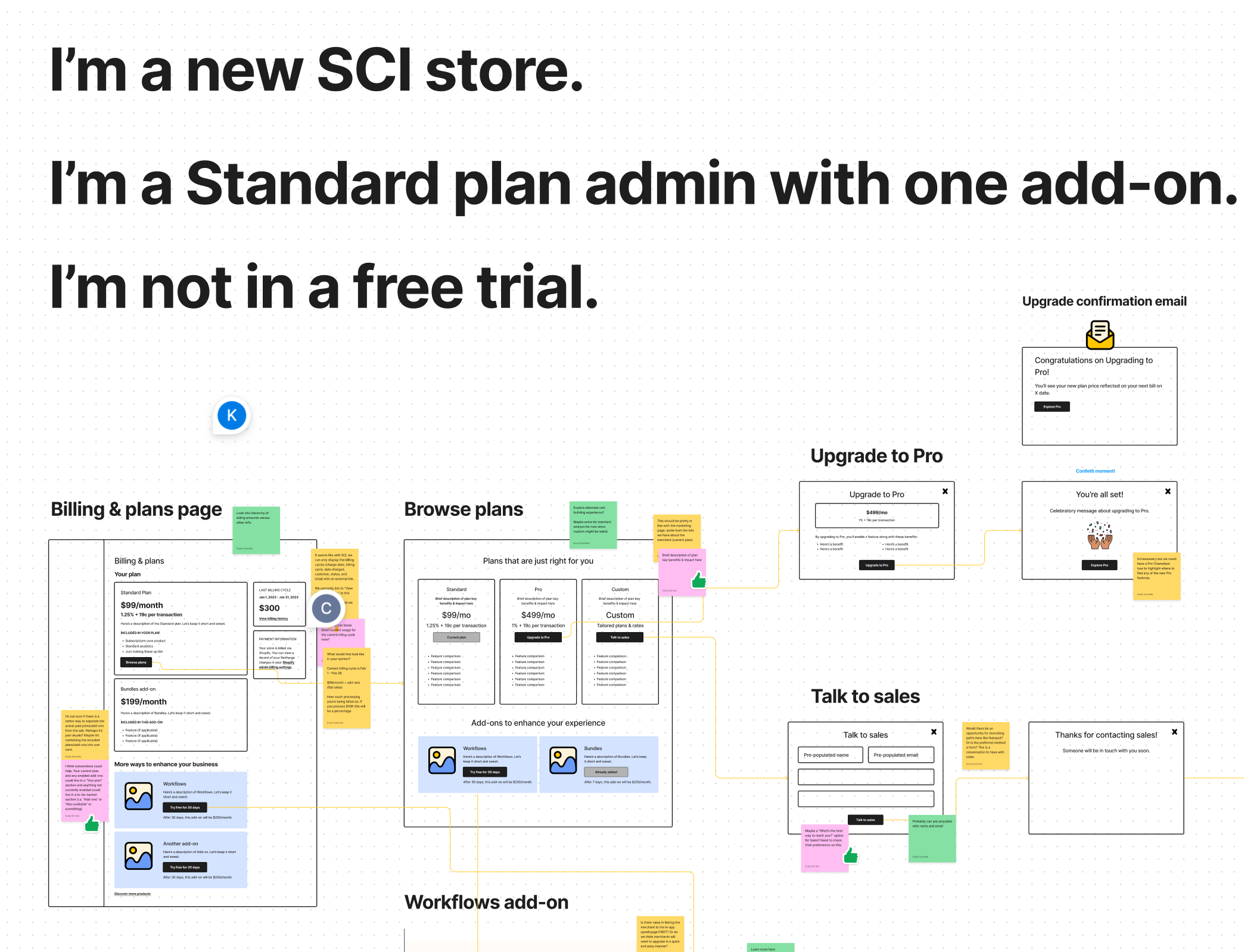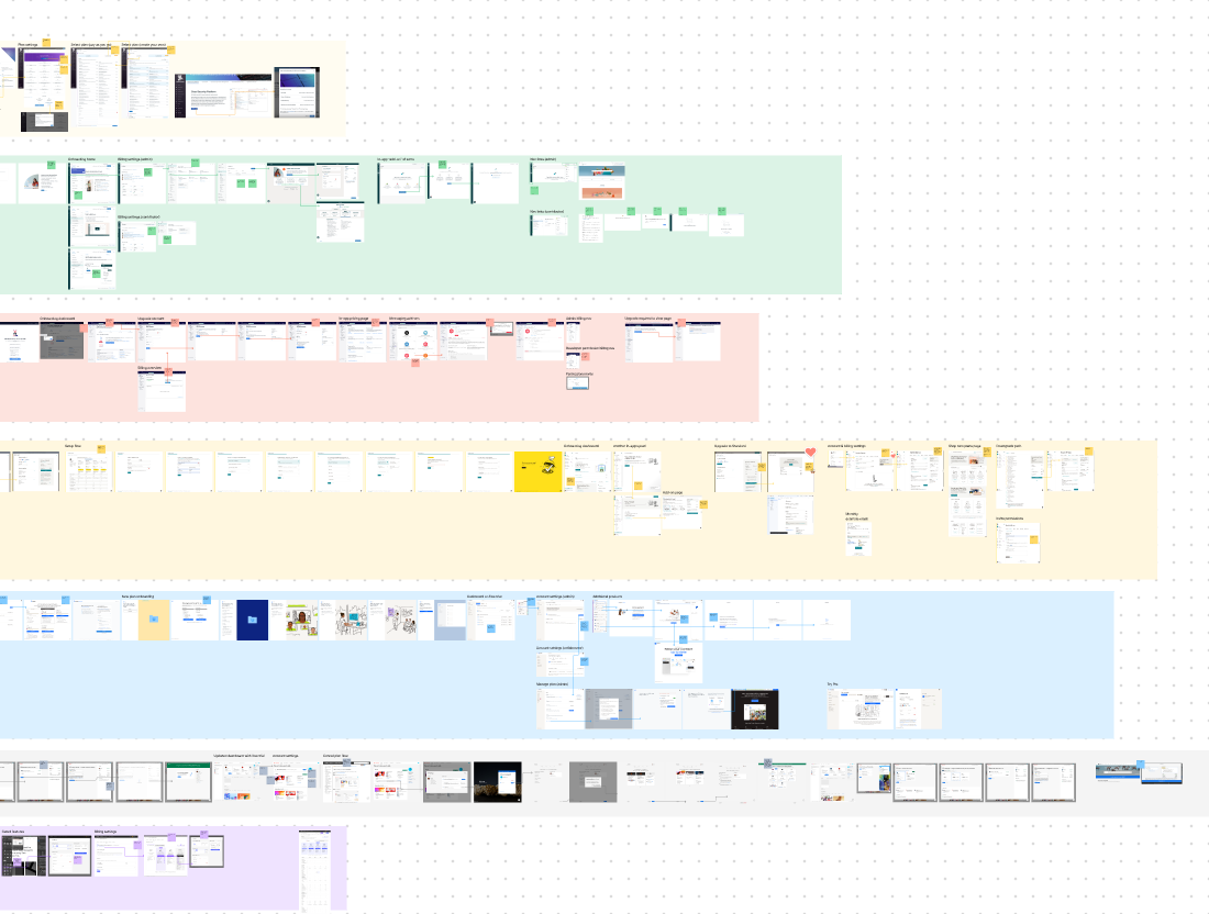 After observing many repetitive and solid patterns, we wanted to envision how a flow like this could work for Recharge. I’m someone who believes in getting ideas out there for feedback quickly, so I threw some quick flows into a FigJam file. I focused on a few things:
